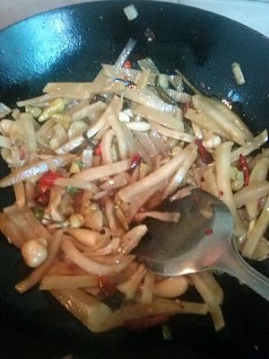 先放油,油沸腾后。把泡萝卜和佐料炒香。