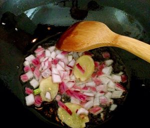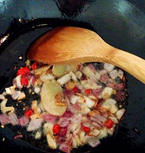 锅中放稍多的油,五成热后先放入姜片洋葱丁中小火炸一分钟。