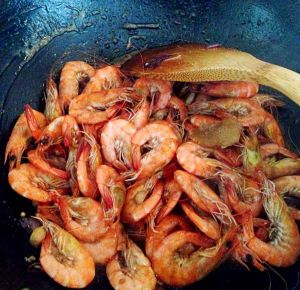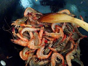 大虾入锅,炒到基本变红时加入料酒。虾入锅后基本可以一直大火。