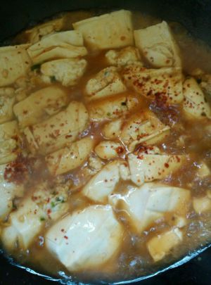 翻面再煎黄后把油倒出,加水、少许酱油闷煮一会儿,豆腐盛出,酱汁导入小碗备用