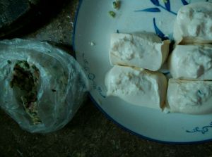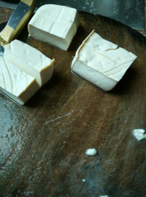把拌好的馅料装进豆腐里(不要装太高咯)