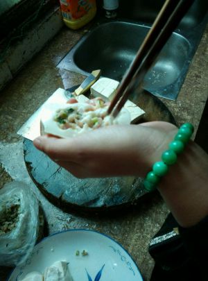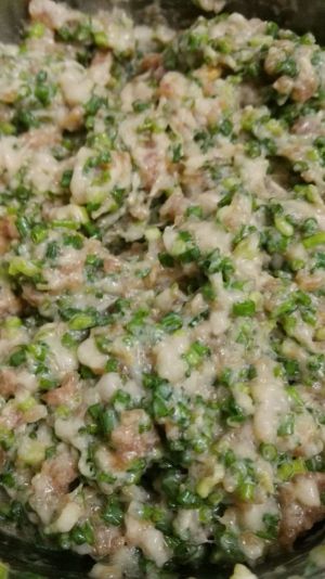 肉剁好后加盐 油 生抽 胡椒粉 淀粉 耗油 鸡精 葱花顺时针搅拌均匀