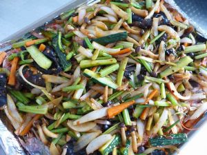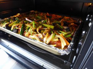 从取出烤鱼盘,烤出来的汁水可以倒掉,把菜铺在表面,再进烤箱继续200℃10分钟。