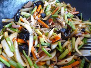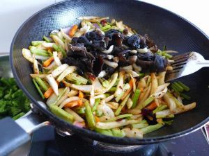 放香菇木耳青椒炒两分钟左右,宽粉铺在表面不要翻,要不会糊锅底。加香菇水,一勺老抽,2勺生抽煮5分钟。