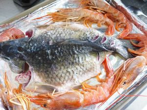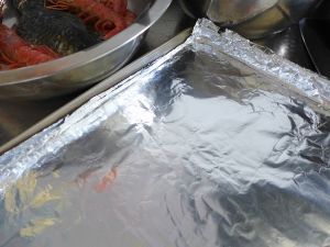 鱼和虾腌制1小时后,摆放在铺好锡纸的烤盘上;