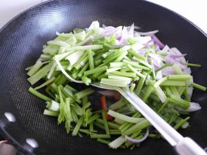 加入5克盐、10克砂糖、10克酱油和适量的芝麻、孜然翻炒至菜7成熟;