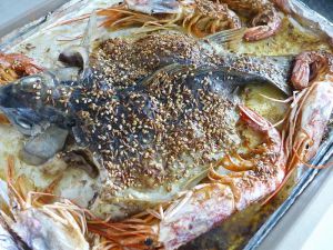 将芝麻和孜然混合后,撒在鱼身上和虾上,入味20-30分钟左右;