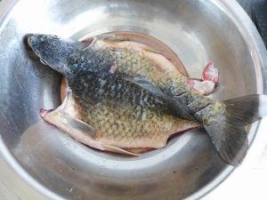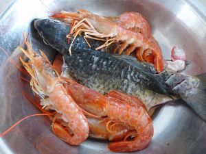 将虾清洗干净,与鲫鱼放在一起,加入5克盐,50克料酒,腌制1小时;