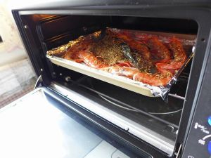 将入味后的鱼和虾送入预热好的烤箱,温度190度25分钟;