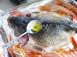 用勺在鱼身和虾上面涂抹橄榄油,每次少涂,反复涂抹几次;