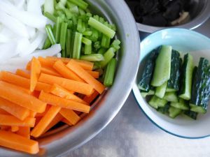 烤鱼过程中,先将洋葱、香芹、黄瓜等配菜切条;