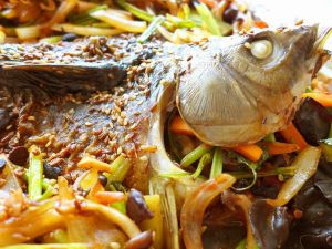 将炒至7分熟的配菜覆盖到鱼和虾身上,汤汁浇在上面;