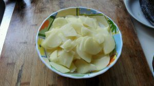 土豆切成厚片,多洗几遍,去掉土豆中的淀粉,洗净备用。