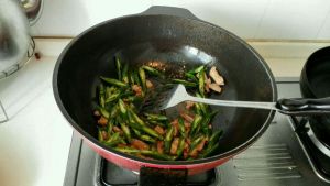 油热下葱和尖椒翻炒,加入一点点味极鲜