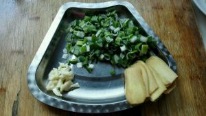 尖椒切块,胡萝卜切片,葱姜蒜切成末备用。
