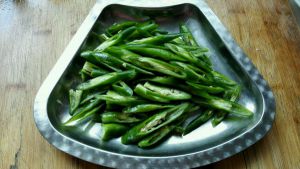 翻炒一会,加入小尖椒,翻炒一会加入葱花 蒜末