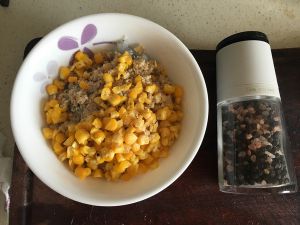 生玉米剥下来的玉米粒,用热水抄几分钟,煮熟,捞出控水,面包撕碎,鸡蛋打成蛋液,和所有调料一起放到虾肉泥里