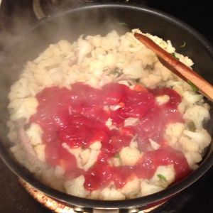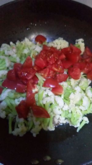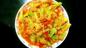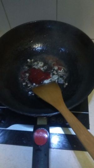 加入菜花,木耳,加清水,调入番茄酱,白糖可以随口味添加,翻搅几下盖上锅盖转小火