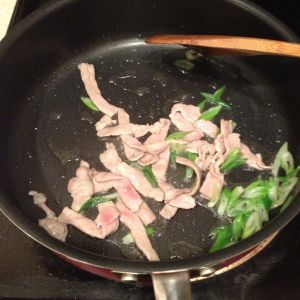 猪肉切片成条状,葱切段。热锅凉油,先下葱炒香,在下肉炒至变色。