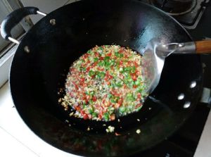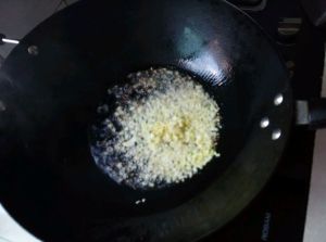放入大蒜姜末入油锅煸炒十几秒,然后放15粒花椒粒。
