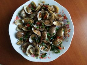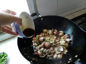 将花蛤滤水后倒入锅中,大火爆炒。大概两分钟左右,花蛤开始微张开。这个时候烹入料酒,少许生抽,加盐,继续爆炒。