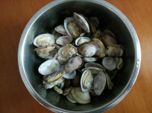 把买来的花蛤放盐泡1-2小时,目的是让它吐出沙子来。然后再用清水洗干净。