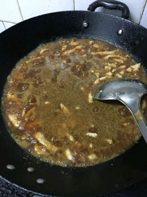 倒入肉丝,大火烧开中火慢炖,至粘稠,肉上粘满酱汁。