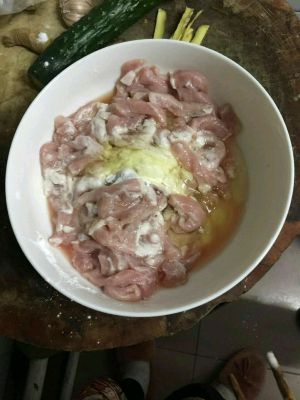 我用的是鸡胸肉,也可以用猪里脊切成丝,放淀粉,料酒,蛋清少放一点盐抓匀
