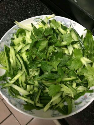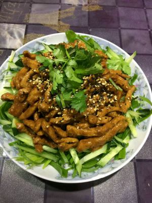 盘中用葱丝,黄瓜丝,香菜摆盘
