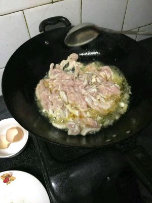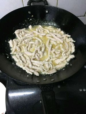 锅热后倒入少许油,油半开后将腌制好的肉丝倒入锅中。快速搅拌