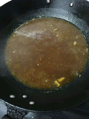 将甜面酱倒入锅中,炒出香味后倒入少量葱姜水、糖和料酒继续翻炒至粘稠;