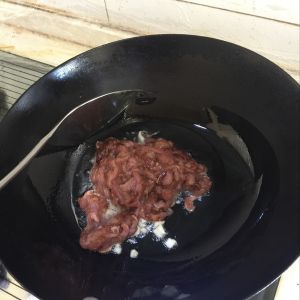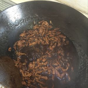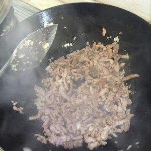 把搅拌好的肉丝下锅,同时不断翻搅防止肉丝粘锅底