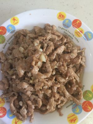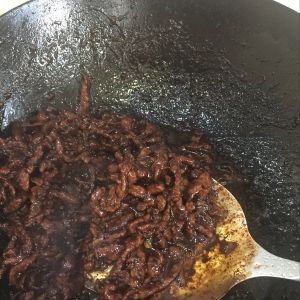 大火炒至酱汁粘于肉丝上。透明的食用油和肉丝酱汁分离开来是放入鸡精调味。