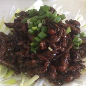 锅中肉丝倒入葱丝碟中。洒上切好的葱花和炸好的芝麻粒。完成。