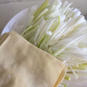 靠近从头的一小节葱切碎泡水。另外靠近葱根的切丝。