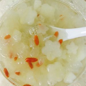 锅内放足够多的水,烧开后放入银耳(银耳泡发后去掉黄色部分,撕成小朵)煮10分钟,再放入雪梨,再煮5-6分钟后放入冰糖,熬至雪梨变软(大概10分钟左右),放入枸杞