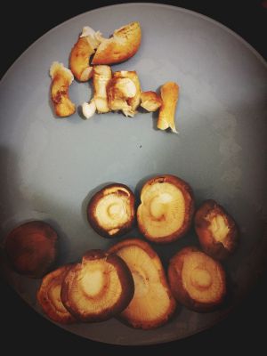 香菇切片,煮好的鹌鹑蛋去壳,备用。