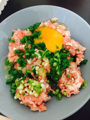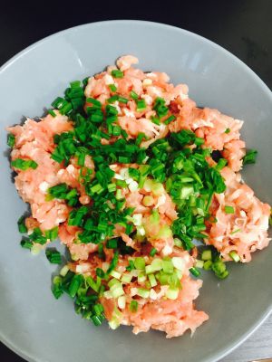 将买来的肉切成肉末(直接买肉末也行)将小葱切末拌在一起