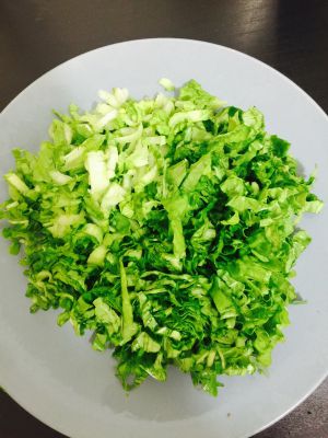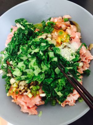 青菜洗净,水开放点油青菜放进去焯水至断生捞出过水再挤干水分切碎,切碎后还会有水分,再次挤干。不然放进肉馅里湿哒哒的