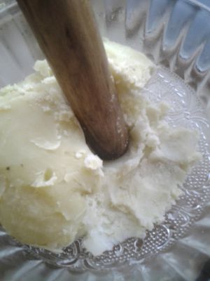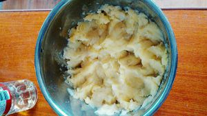 蒸熟的土豆去皮在案板上碾成泥