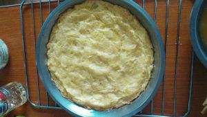 在匹萨盘内铺好油纸后,将土豆泥平铺在盘内压实,放入烤箱200℃,15min,烤至半熟,表面上色即可~(我放的鸡蛋液有点多,而且土豆也不止300g,所以烤完看起来有点像鸡蛋饼……)