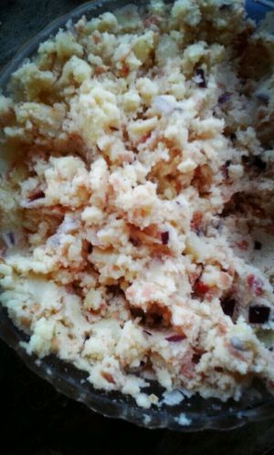 蒸熟的土豆塌成土豆泥,牛肉土豆泥面粉放盐放油搅拌均匀