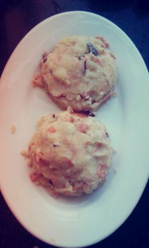 将变软的土豆压成泥,并将鸡蛋打匀,到一半鸡蛋液到土豆泥中,加入适量盐拌匀。