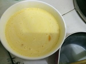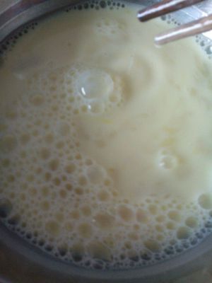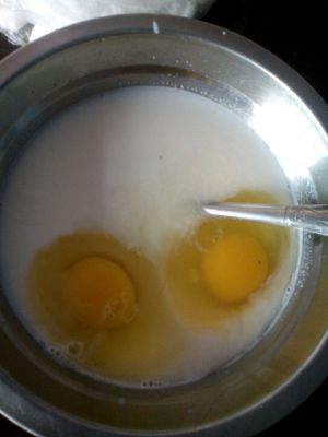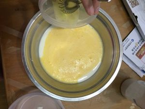 鸡蛋打散,加入牛奶中!如果有加热牛奶,要等牛奶冷却后再加入蛋液!