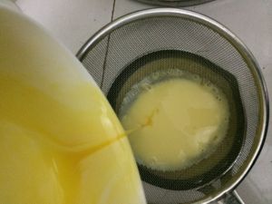鸡蛋打散,倒入牛奶中,搅匀,过筛三次