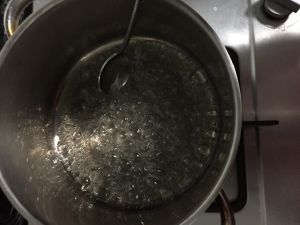 在锅里放入糖和水,用中火加热。煮到糖水沸腾,继续用中火熬煮。