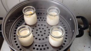 放入蒸锅中隔水蒸到布丁液凝固(大约30多分钟)