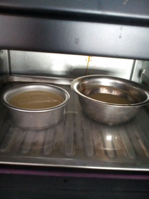 然后放烤盘中层。170度烤50分钟左右。烤盘里放水。我之前烤30分钟没出焦糖,后来又加了30分钟才出的。所以个人觉得时间要加长。