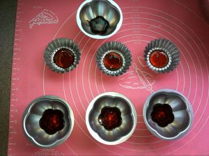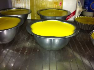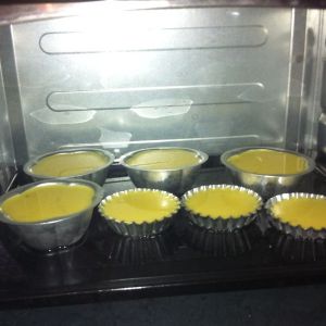 静置30分钟后,水浴,上下火,ACA烤箱190度,30分钟左右。烤好后拿出斜放膏体是结的不漏出就是烤好了。