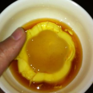 如果表面有小气泡 那用牙签刺破 布丁模具周围的密集小泡可以用纸巾吸走 象图上那么光滑即可